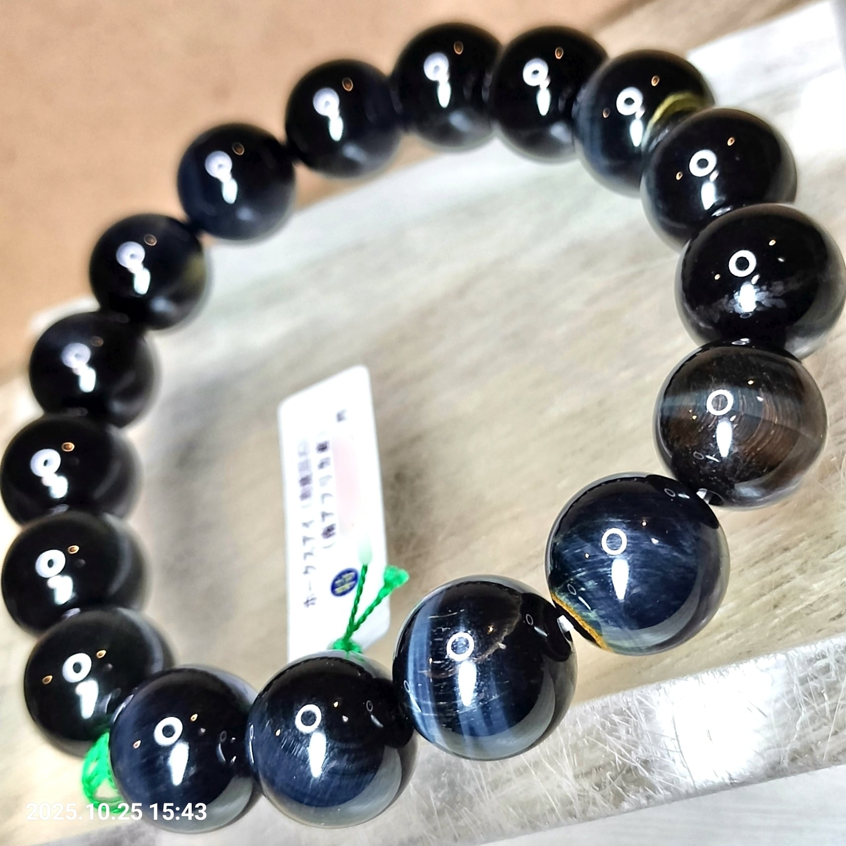 深みのある黒〜青の地色に、光の加減で美しいシャトヤンシー(光の帯)が浮かび上がります。12mmの大粒サイズで、存在感と高級感のある逸品です。
