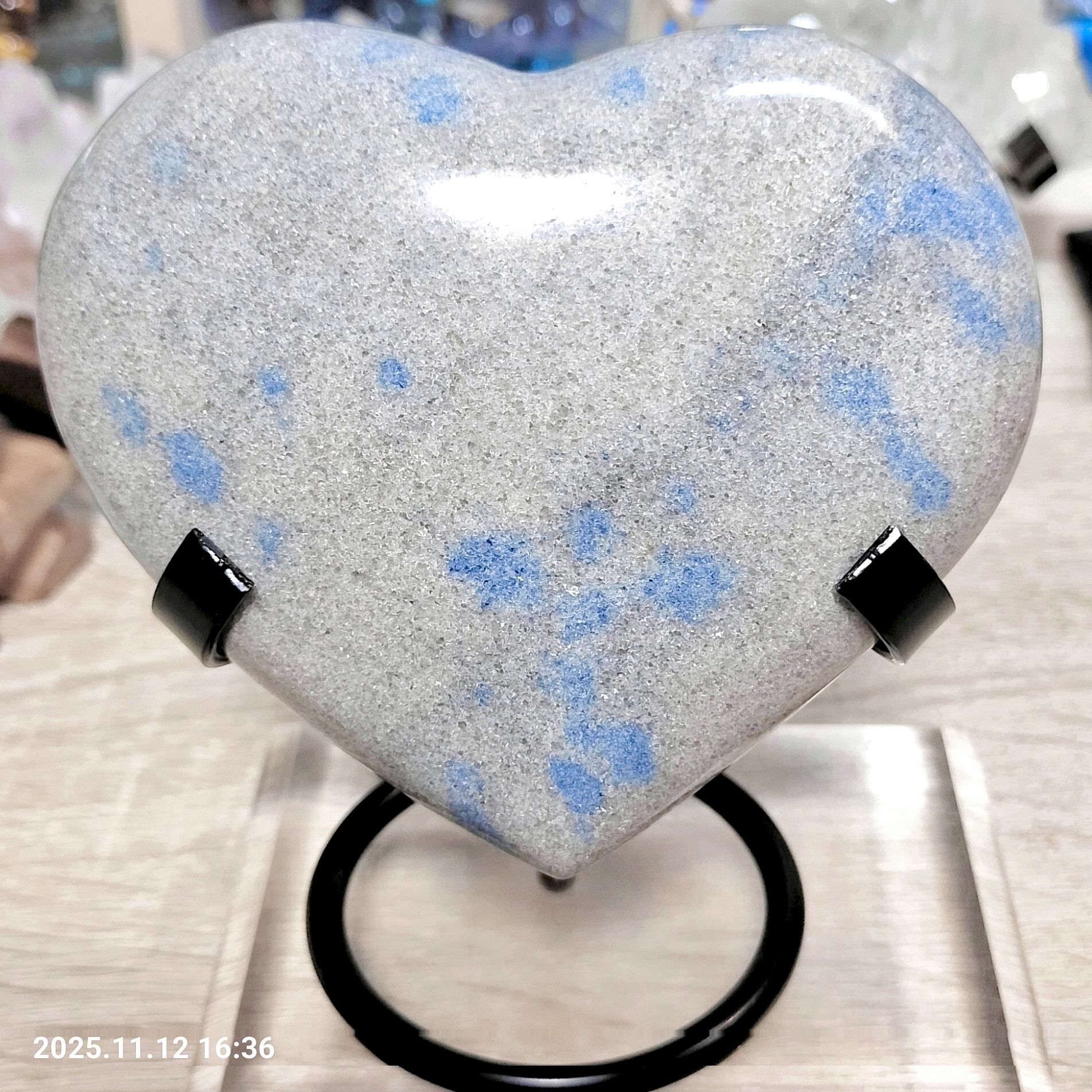 白い花崗岩の中に鮮やかな青色のアズライトが浮かぶ、K2ストーン特有の模様が美しく、こちらの個体は 442gの大型ハートに加工・研磨されています。アズライトの青斑もはっきりと分かり、インテリアとしても存在感があり、このサイズ・グレードのものはとても希少で、コレクションなどにも大変オススメです(^^)