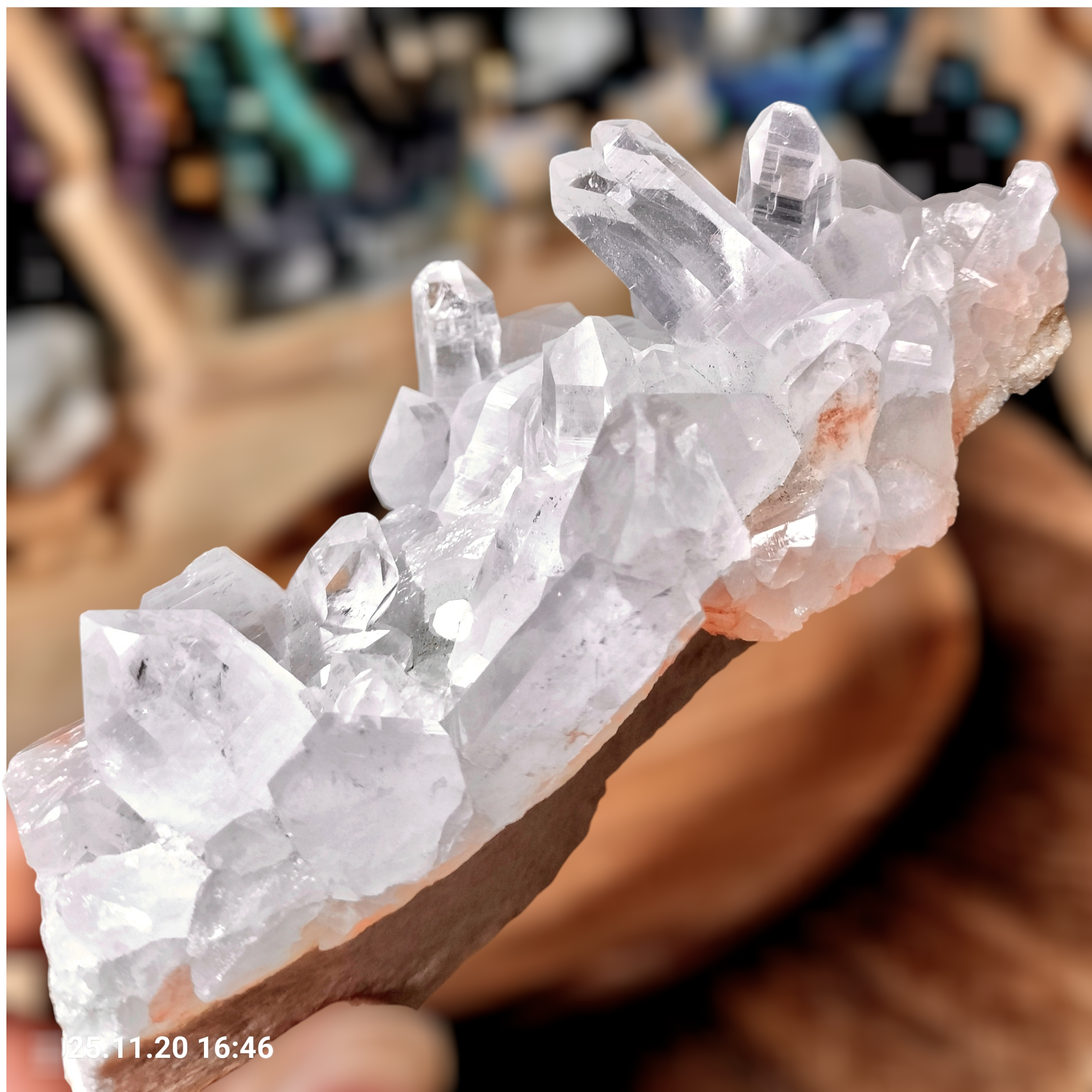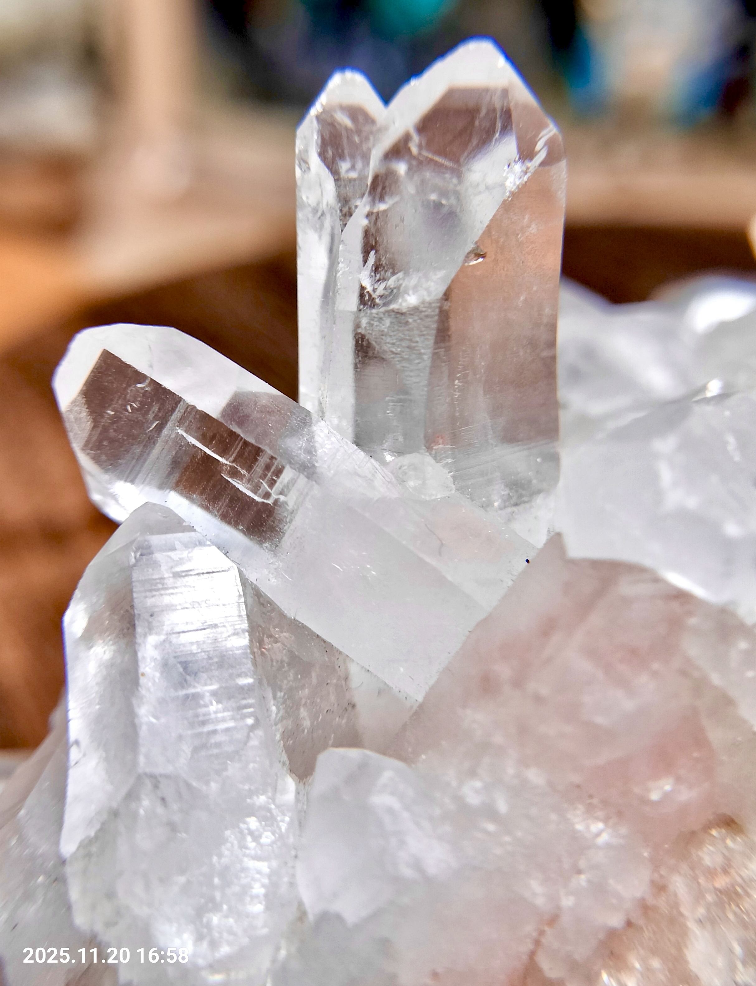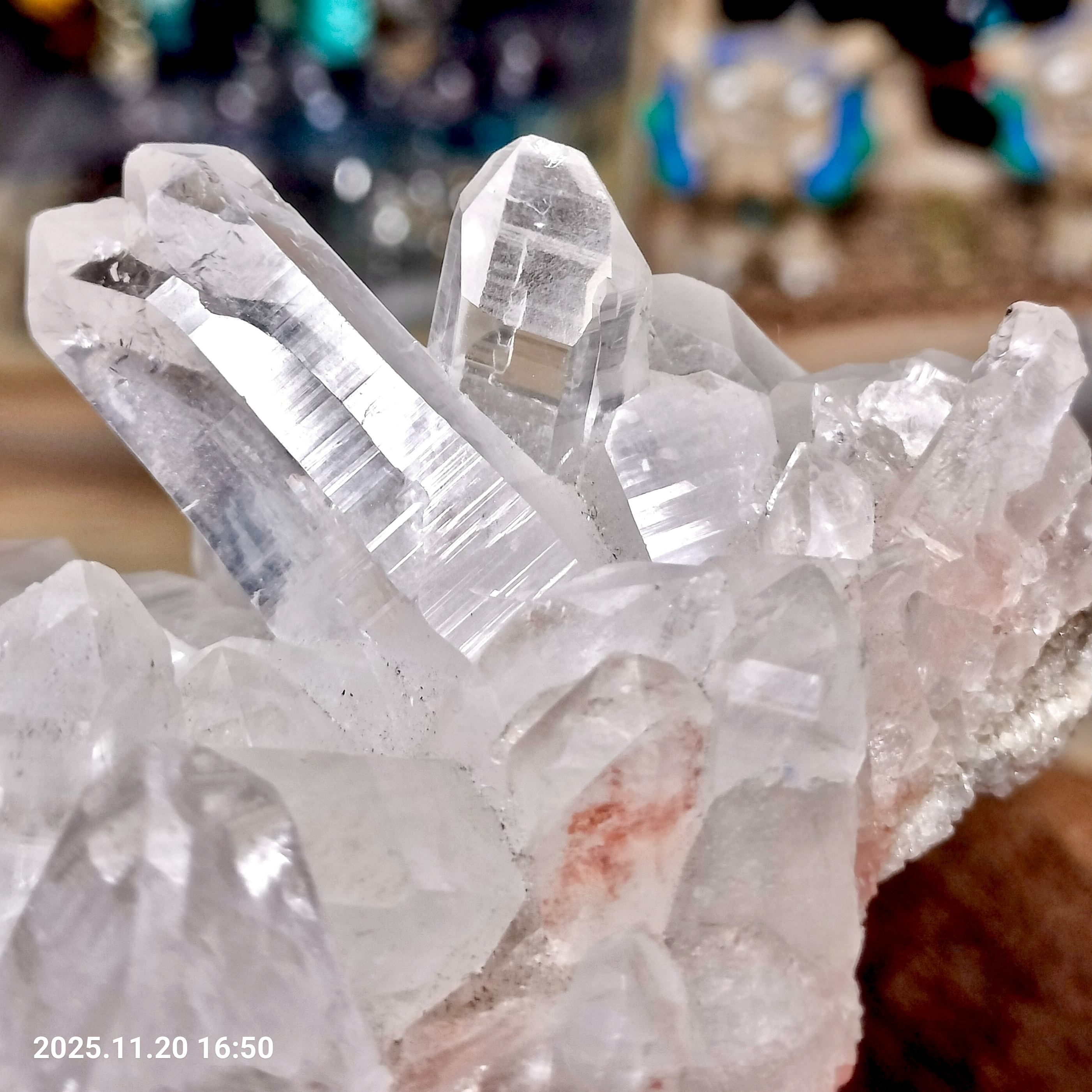 ヒマラヤ水晶の中でも人気の高いピンクマニカラン水晶で、特に高品質な透明感のある氷質ポイントが立ち上がり、母岩のホワイトとピンクの部分もキラキラとしていてとても美しいクラスターです!