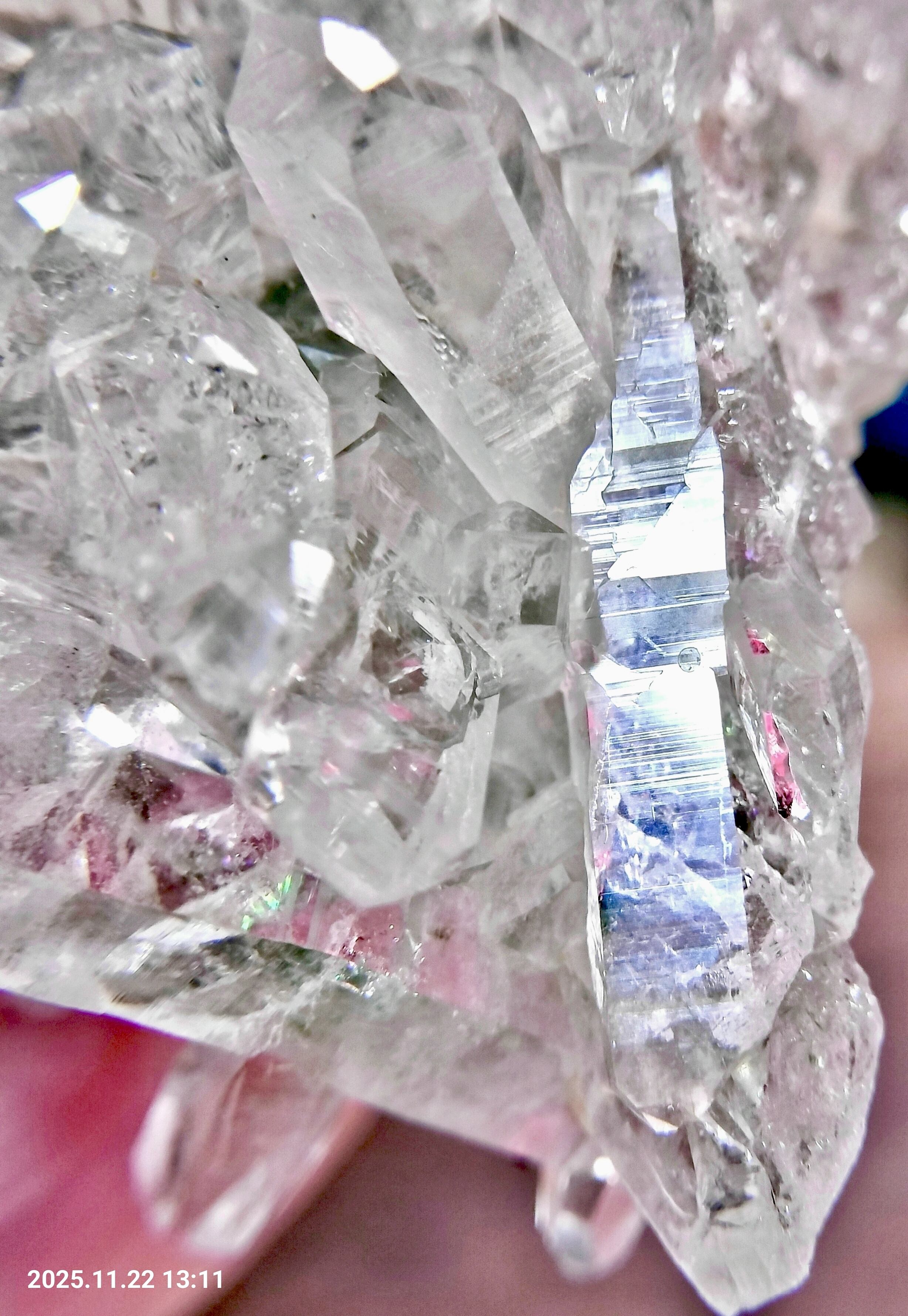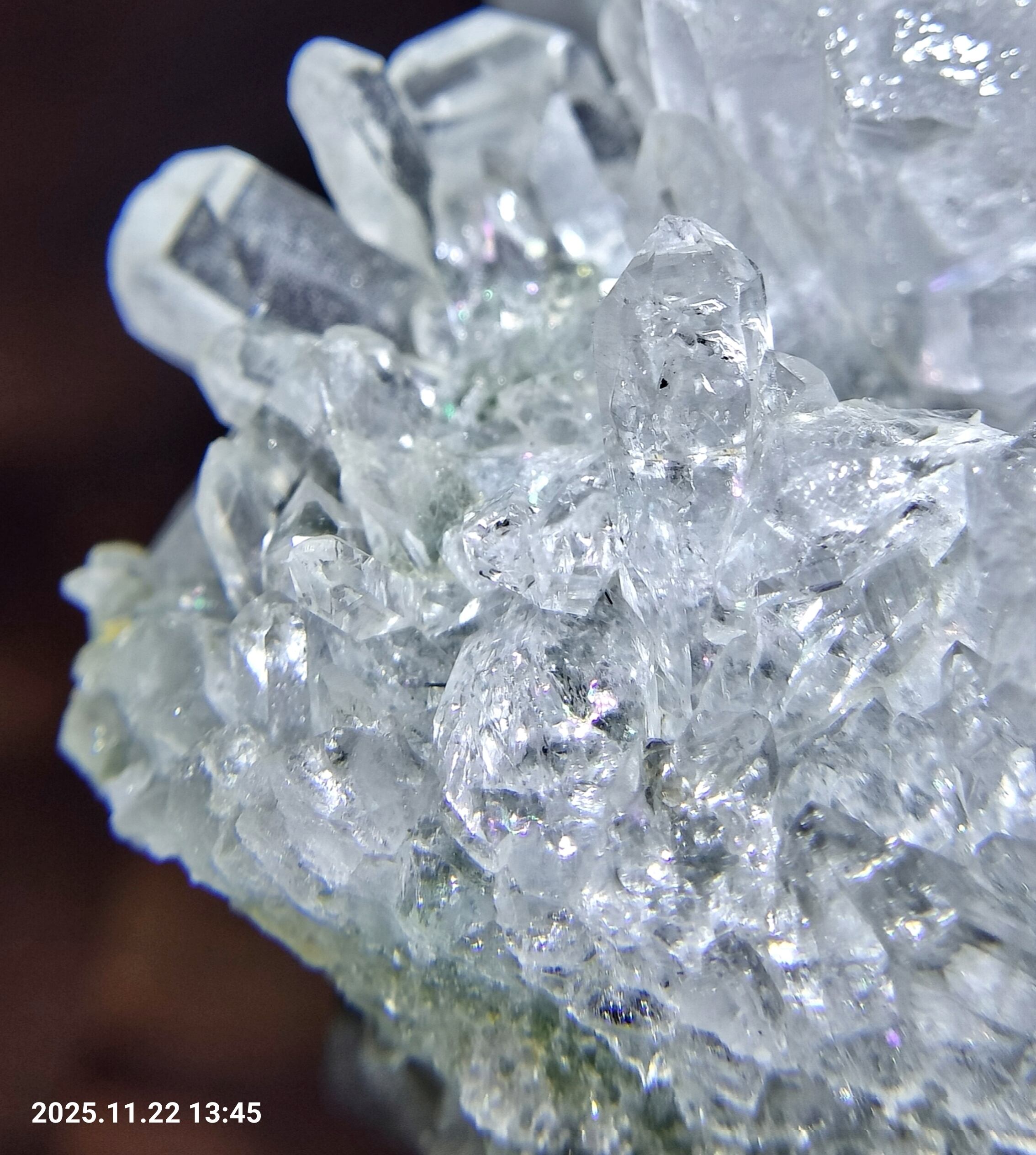透明度がとても高い水晶ポイントが放射状に成長し、結晶面の照りが強く、虹が数え切れない程確認できます。