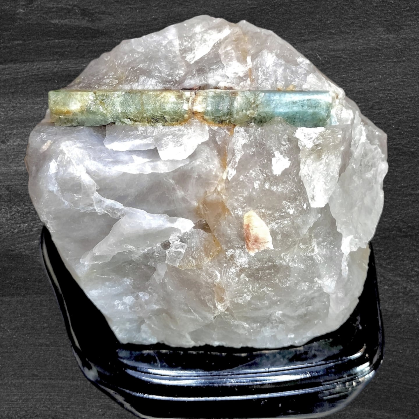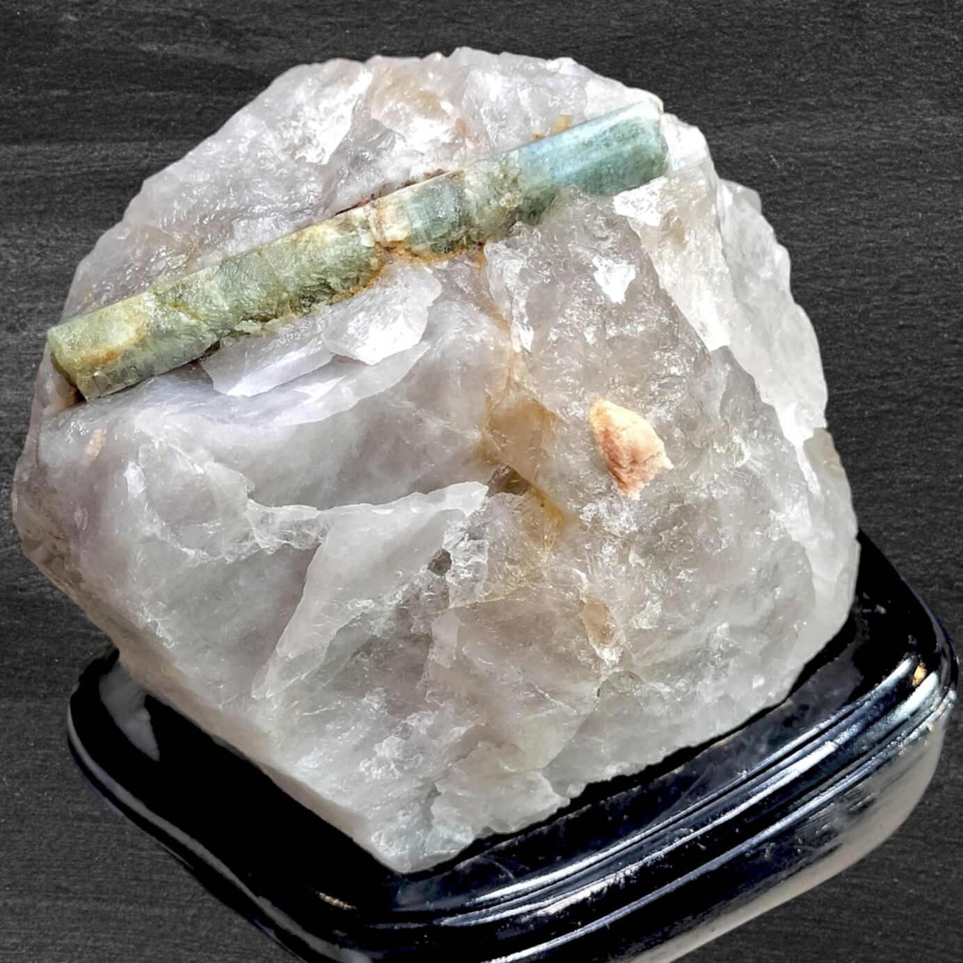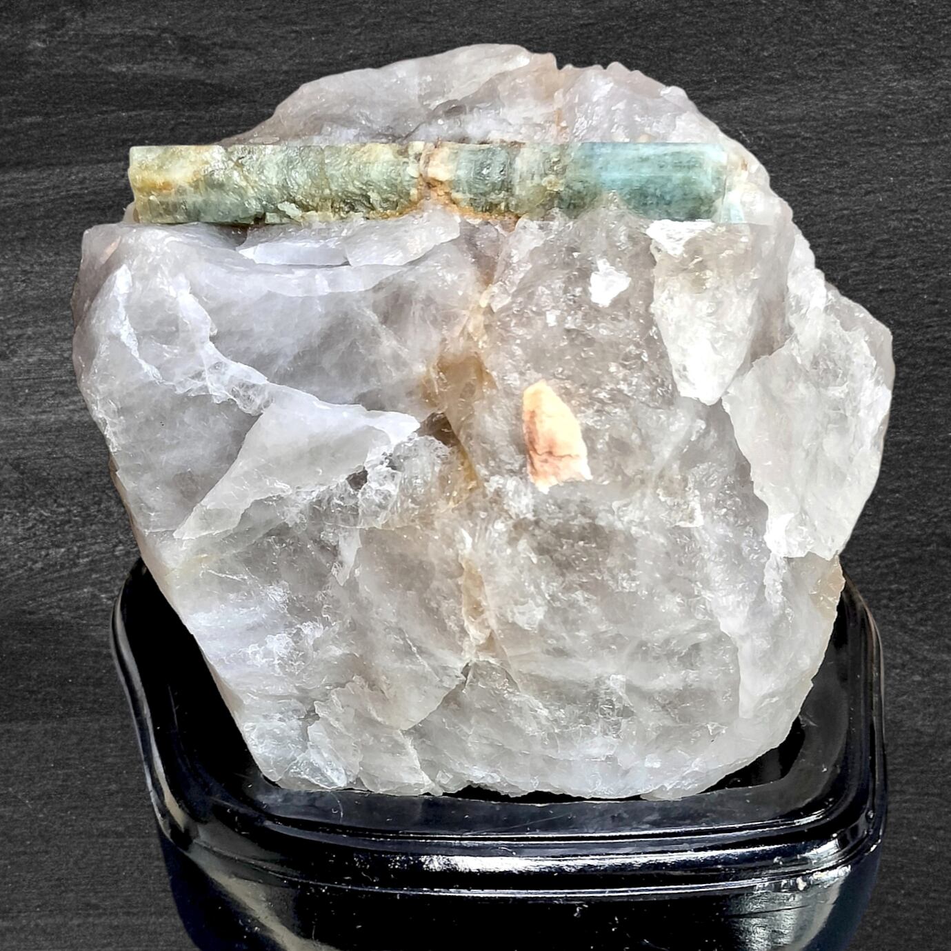 母岩は石英主体ではなく、アルバイト(曹長石)系長石を主体としたペグマタイト母岩で、その中でアクアマリン結晶が成長しており、結晶の生成環境を視覚的に理解できる点も、鉱物標本として高く評価されるポイントです。